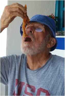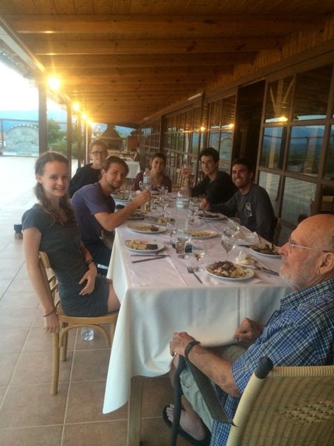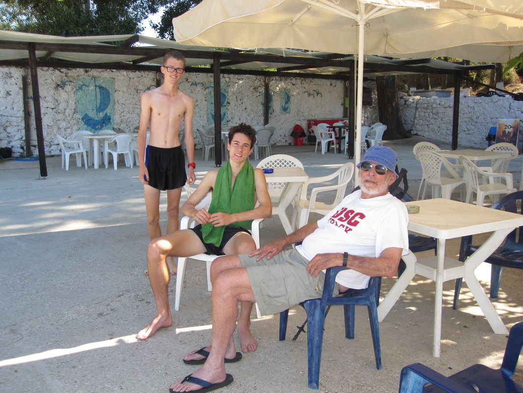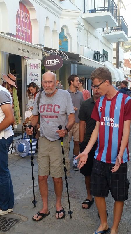 Grandson Liam Taylor helps grandfather Bill Taylor to evening meal on Patmos. The marvelous island was well worth the travel time and expense.