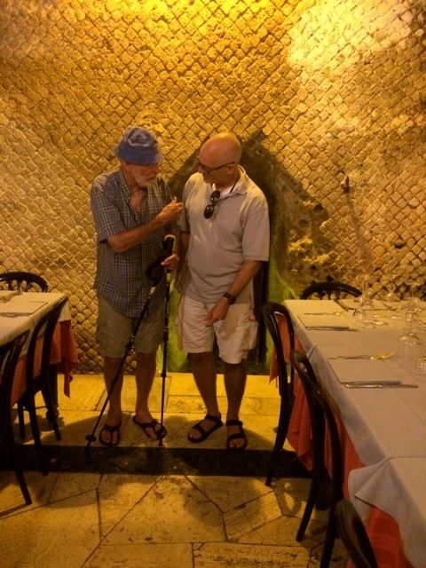 Our third leader, Rich Murphy, joined us in Rome and even though he knows Bill very well, and is hardly surprised at his spontaneous behavior, he was startled when Bill disregarded a head waiter screaming "It is impossible!" and went ahead to lead Arete students down into the cellar of a private party restaurant. But Rich understood when Bill pointed to where Julius Caesar was murdered. Photo shows Rich helping Bill up the steps from the cellar of the restaurant.