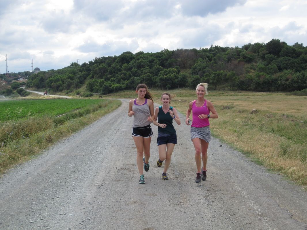 Aislinn, Ellen and Julie returning from their Homeric run on the battlefield of ancient Troy.