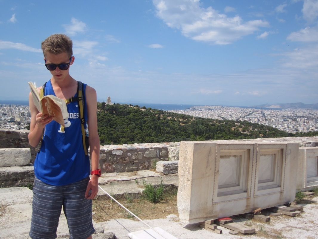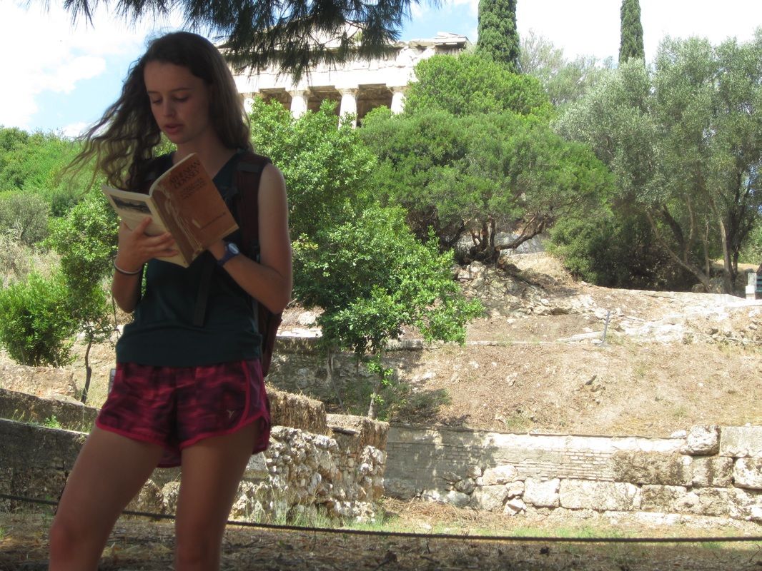 Aislinn reads from Mr. Taylor's book "Athenian Odyssey" only a few meters from where Socrates taught young Plato in the ancient marketplace in Athens. Super!
