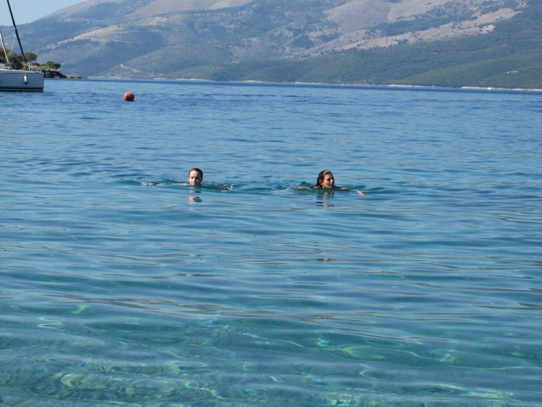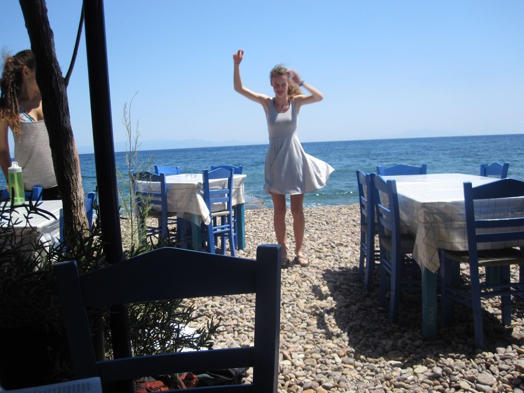 Arete once again raced from the Nostos hotel, up to the village of Stavros and over the ridge and down to the sea, in our anticipated "handicap" race. These two girls, Aislinn and Ellen, continued floating after finishing the arduous run.