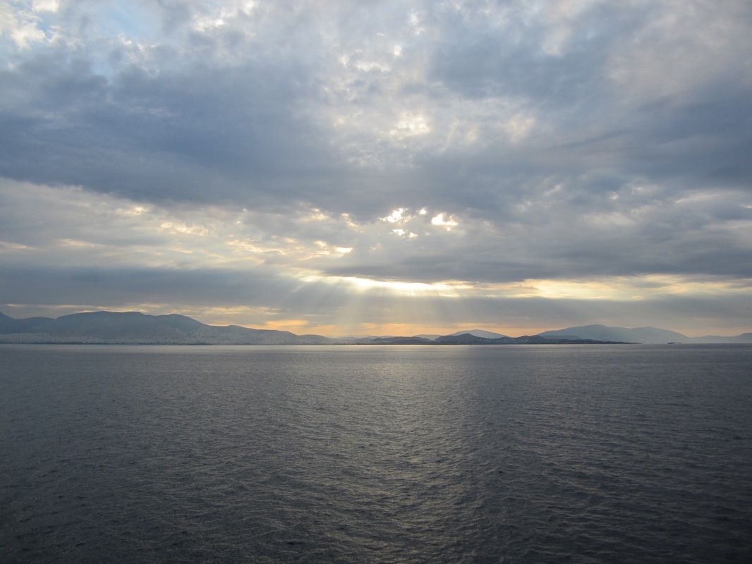 Absolute beauty as we sailed away from Greek shores toward Italy. Bill would disembark in a wheelchair on a swift moving escalator. The Arete students insisted on this exit tactic.