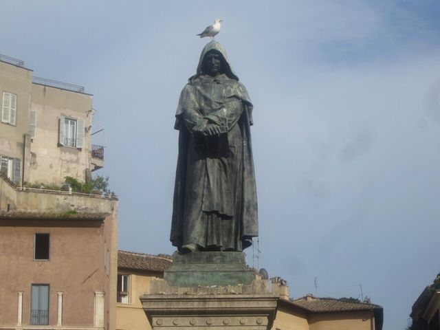 Bruno was a brilliant, honest man, who was burned alive by the church on this very spot for independent thinking. Perhaps there is irony in this picture in light of the seagull? Like, the casual treatment of life. The more religious, the more "casual?"