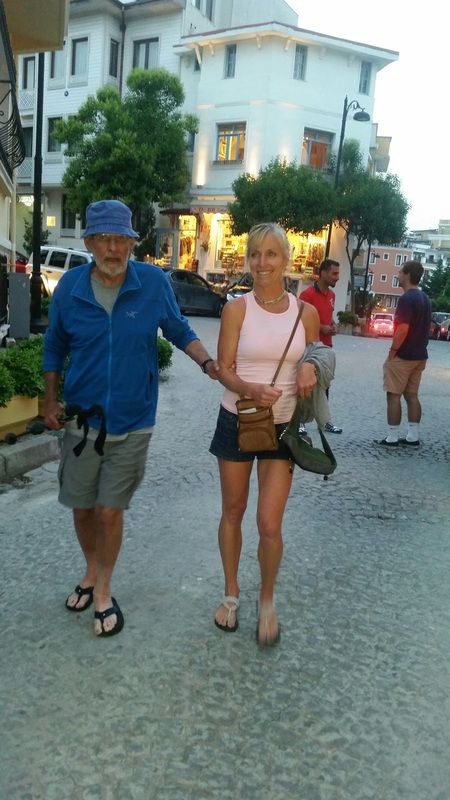 Julie helps Bill to dinner table in Istanbul. These precarious moments were negotiated successfully thanks to an alert Julie.